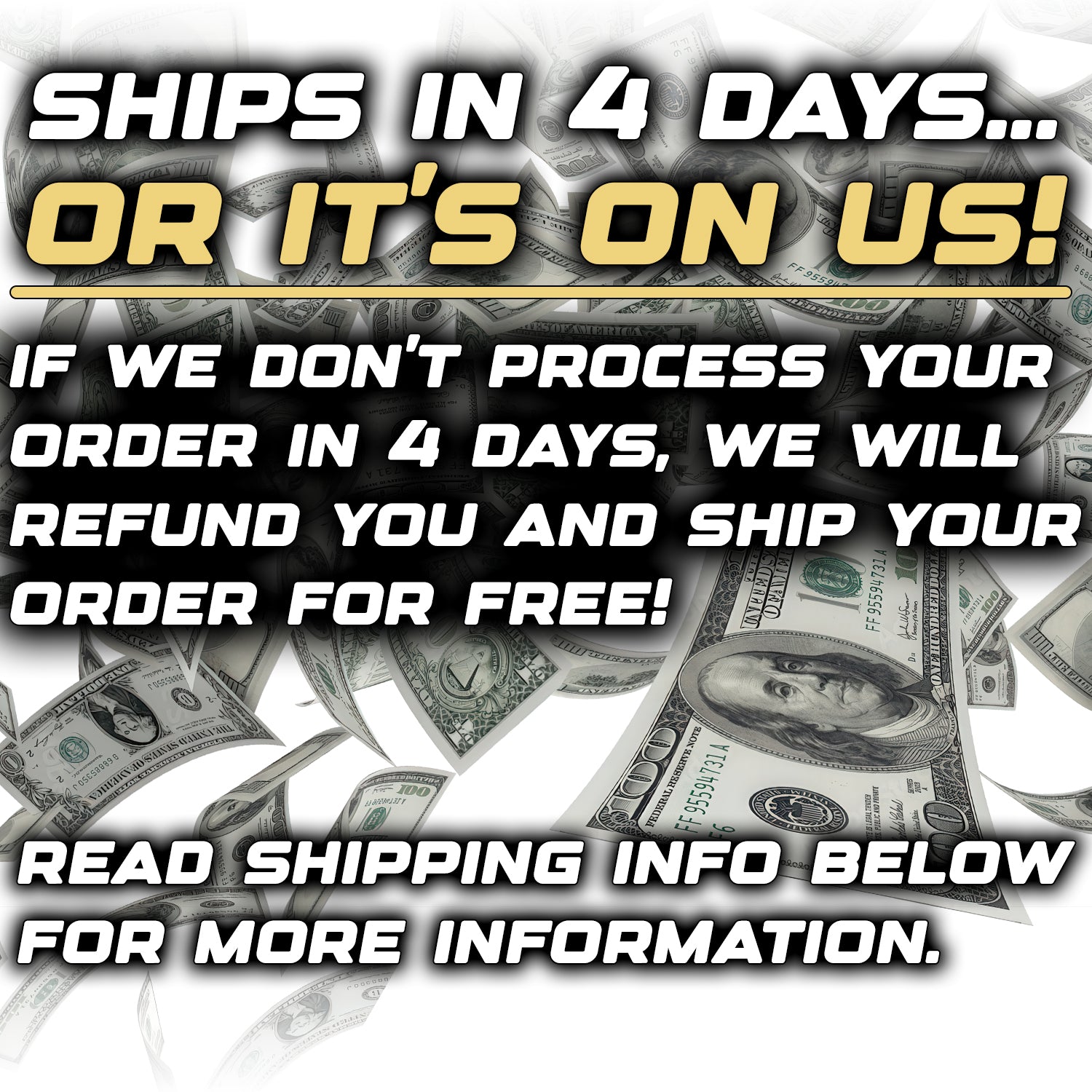 If we do not process your order within 4 days, we will refund your order and ship it to you for free! No waiting 3 months to get your gear. This does not include shipping time.